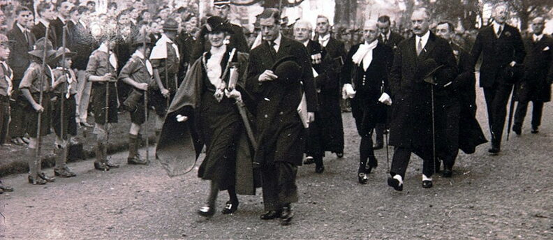 In 1932 Prince Edward visited Worcester to open the new bridge over the River Severn in the centre of Worcester. This photo shows Claines Boy Scouts (notice the green and white neckers) creating a guard of honour in Cripplegate Park. Notice that up to this point no Boy Scout would be on parade without their Scout Staff in their right hand.