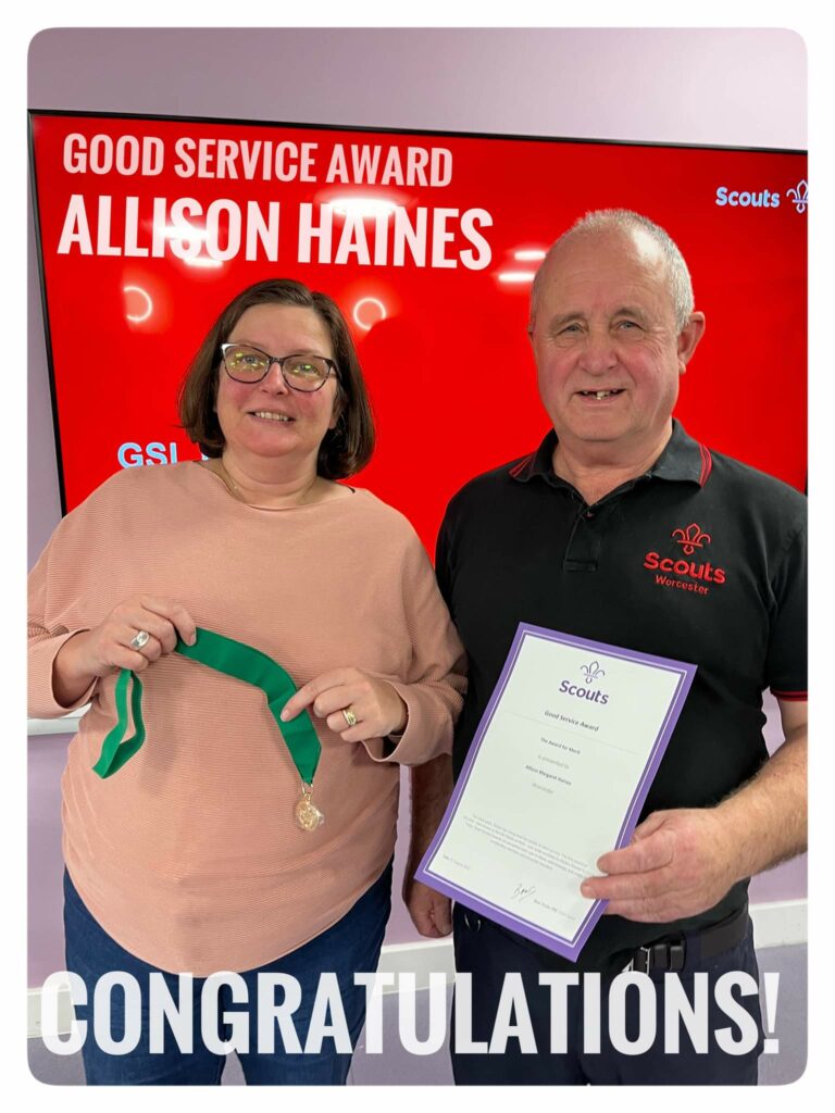 Allison Haines our Group Scout Leader has been awarded the Chief Scouts Commendation for Good Service. Awarded to individuals who have volunteered for more than 5 years, and whose great contribution to the Scouts stands out. Well done Allison richly deserved.